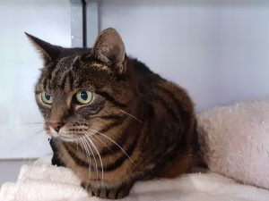 Binkie is een lieve flinke poes. Ze is afgestaan en moest bij ons eerst even wennen.  Binkie bemoeit zich verder niet met haar soortgenoten, maar accepteert ze wel. Het liefst gaat zij haar eigen gangetje. Zij wil graag naar buiten, maar …. zoals we haar hebben leren kennen, ligt zij nog liever gezellig binnen in een zachte mand of hoog in een krabpaal. Binkie krijgt 1 x daags pijnstiller omdat ze last heeft van artrose in haar rug en daarnaast moet Binkie wat afvallen dit is namelijk beter voor haar gewrichten en rug.