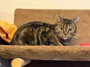 Spikkeltje komt hier steeds meer los. Ze blijft nog wel een aardige uitdaging om haar zo ver te krijgen dat ze vertrouwen opbouwt. Ze verstopt zich in ieder geval niet meer, maar houdt nog wel iedereen op afstand. Ook voor Spikkeltje zoeken we iemand met enige kattenervaring.
